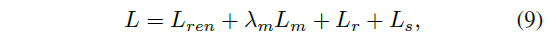 마스킹 L_m과 지오메트리 코드북 L_r, L_s에 대한 loss를 더하여 전체 loss L은 다음과 같습니다