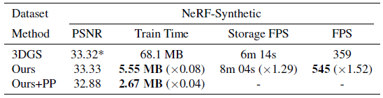 그 결과, 높은 성능을 유지하면서 3DGS에서 25배 이상의 압축을 달성했습니다.