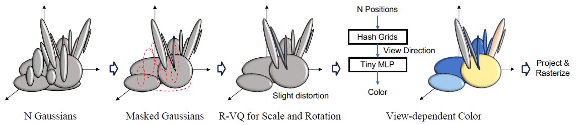 이를 위해 최적화 과정과 함께 성능에 최소한의 영향을 미치고 지오메트리 속성을 코드북으로 나타내는 가우시안을 그림 2와 같이 마스킹합니다.