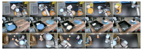 로봇은 밀집된 어수선함을 처리하고 다양한 액션을 지능적으로 시퀀싱해야 합니다 — 예를 들어, 쓰레기로 접시를 닦으려면 먼저 접시를 집어 들고 내용물을 쓰레기통에 흔든 다음 접시를 쓰레기통에 넣어야 합니다.