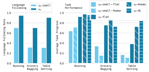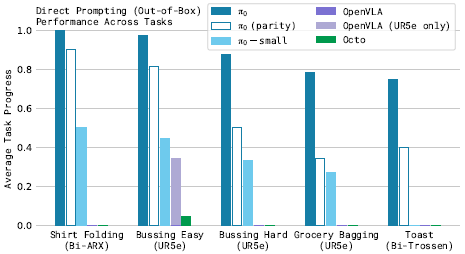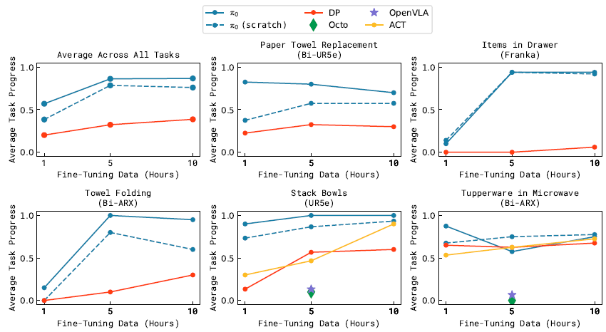 결과에 따르면 π_0는 이러한 작업 중 많은 부분을 해결할 수 있으며, 전체 사전 학습 및 파인튜닝 레시피가 전반적으로 가장 우수한 성능을 발휘합니다.