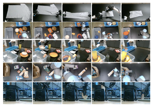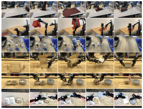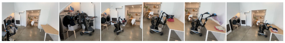 예를 들어, 우리의 세탁 접기 작업은 로봇이 어떤 구성에서든 시작할 수 있는 다양한 의류 품목을 조작하고 여러 품목을 순차적으로 접어야 합니다.