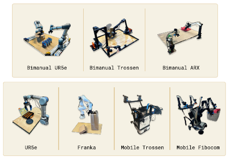 이러한 다양한 로봇 유형은 싱글 및 듀얼 암 시스템뿐만 아니라 모바일 매니퓰레이터를 포함한 다양한 구성 공간과 action 표현을 가지고 있습니다.