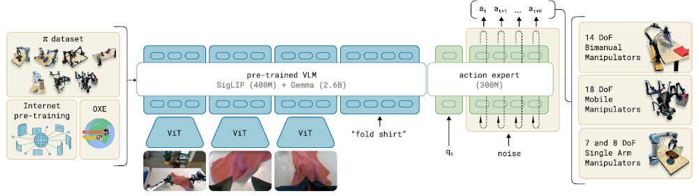 우리 모델은 복잡한 고주파 액션 청크를 표현하기 위해 플로우 매칭과 함께 인터넷 규모의 vision-language model (VLM) 사전 학습을 통합합니다.