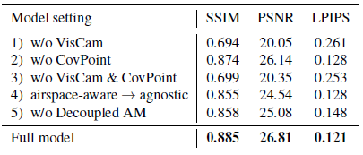 표 3과 그림 8의 네 번째 행에서 볼 수 있듯이, 공역 인식 가시성 계산을 기반으로 선택된 카메라는 셀 최적화를 위한 더 많은 supervision을 제공하므로 공역에 구애받지 않는 방식으로 가시성을 계산할 때 나타나는 플로터를 생성하지 않습니다.