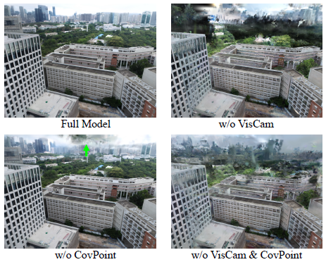 그림 6과 표 3에 나타난 바와 같이, 가시성 기반 카메라 선택 (VisCam)과 커버리지 기반 포인트 선택 (CovPoint) 모두 시각적 품질을 향상시킬 수 있습니다.