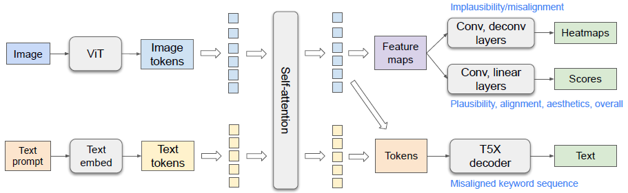 이 논문에서는 단일 스칼라 점수보다 이미지 품질에 대한 훨씬 더 풍부한 이해를 제공하는 해석 가능하고 귀인 가능한 세밀한 다면 평가 데이터셋과 모델을 제안합니다 (예: 아티팩트/불신뢰성 또는 이미지-텍스트 정렬 오류가 있는 영역).