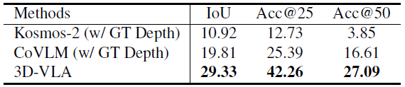 표 2에서 3D-VLA는 로컬화 성능 측면에서 2D 기본 방법에 비해 현저한 우수성을 보여줍니다.