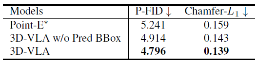 따라서 이미지, depth 및 포인트 클라우드를 생성하는 기능을 3D-VLA에 도입할 것을 제안합니다.