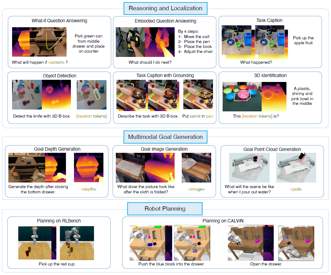 이와 같이, 우리는 2M 3D-언어-액션 데이터 쌍을 수집하며, 그림 1과 같이 작업 캡션, 행동 예측, 위치 추정, 멀티모달 목표 생성 등 다양한 작업을 다룹니다.