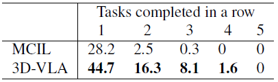 표 6에서 3D-VLA는 CALVIN에서도 유망한 결과를 얻었습니다.