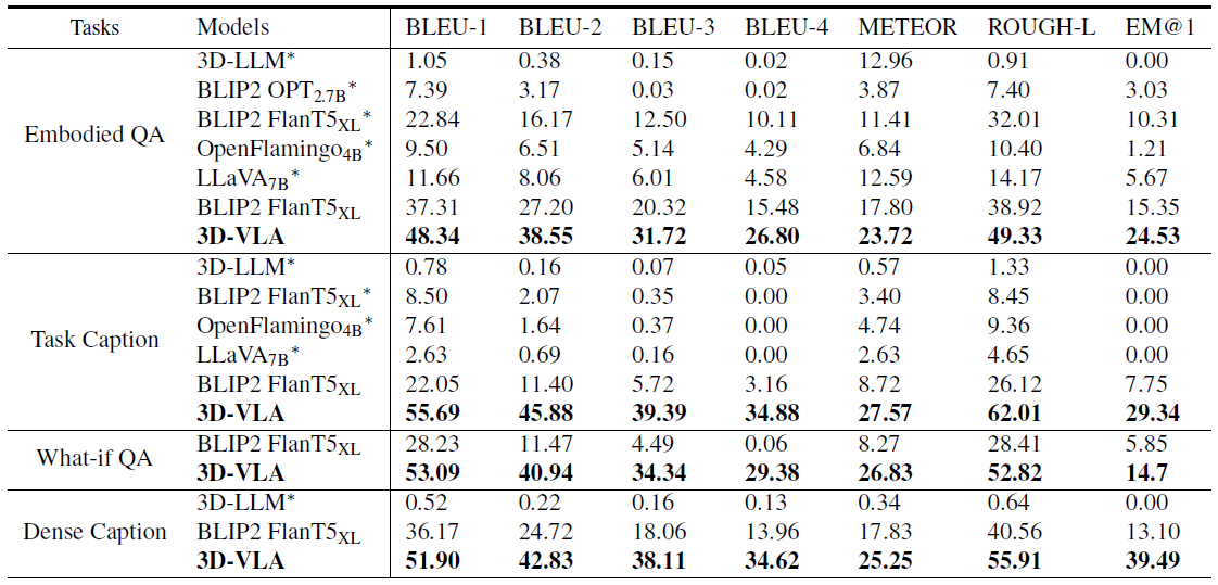 우리는 3D-VLA를 BLIP2 (Li et al., 2023b), OpenFlamingo (Alayrac et al., 2022), LLaVA (Liu et al., 2023)를 포함한 3D-LLM 및 2D 비전-언어 모델과 비교합니다.