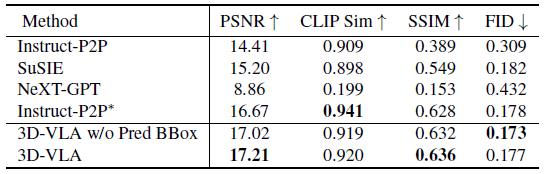 우리가 사용한 동일한 로봇 데이터셋 (표의 4행)으로 학습된 Instruct-P2P*와 직접 비교해도 3D-VLA는 일관되게 그 성능을 능가합니다.