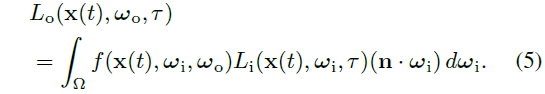 우리의 시간 분해 렌더링 방정식은 식 1의 수정된 버전으로, 비행 τ 시간을