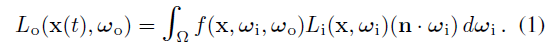 이 방정식은 BRDF f로 가중된 방향 ω_i에서 x에 도달하는 입사 래디언스 L_i를 적분합니다.