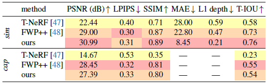 표 1에서 시뮬레이션된 장면과 캡처된 장면 모두에 대한 정량적 결과를 보고합니다.