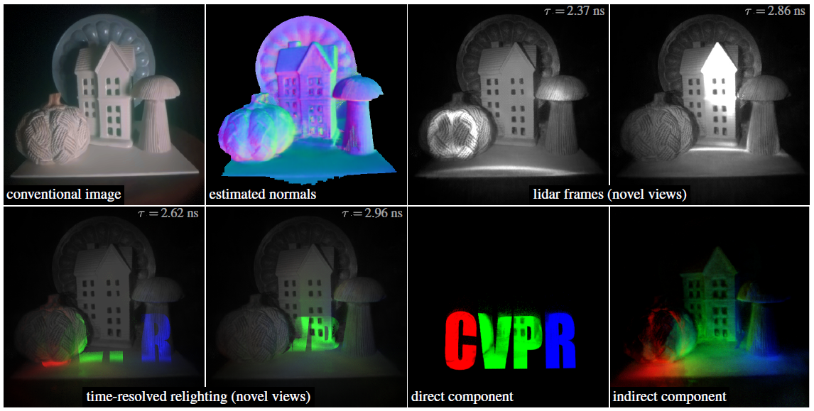 우리의 연구는 라이다 시스템에서 전파되는 빛의 다중 시점, 시간 분해 측정값을 모델링하고 반전시켜 장면 지오메트리를 복원하고, 새로운 시점과 새로운 조명 조건에서 전파되는 빛의 비디오를 렌더링하는 것을 목표로 합니다 (그림 1 참조).