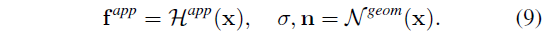 마찬가지로 해시 인코딩 기반 신경망 N^geom은 밀도와 법선을 통해 장면 기하학을 나타냅니다.