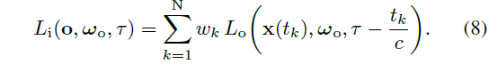 위의 내용은 시간 τ에서 ω_i 방향으로 o′에 입사하는 빛이 ω'_o를 따라 각 점 x′를 떠나는 지연된 빛의 복사본의 합이며, 지연은 ray 매개변수 t_k에 의해 주어진 o′까지의 거리에 따라 달라진다는 것입니다.