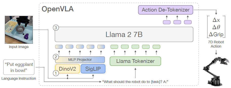 OpenVLA는 사전 학습된 DINOv2와 SigLIP의 피쳐를 융합하는 시각 인코더와 결합된 Llama 2 언어 모델을 기반으로 합니다.