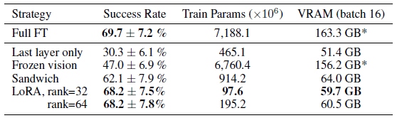 구체적으로 다음과 같은 파인튜닝 접근 방식을 비교합니다: 전체 파인튜닝은 섹션 5.2에 설명된 대로 파인튜닝 중에 모든 가중치를 업데이트합니다; 마지막 레이어는 OpenVLA의 트랜스포머 백본과 토큰 임베딩 행렬의 마지막 레이어만 파인튜닝합니다; frozen 비전은 비전 인코더를 freeze하지만 다른 모든 가중치를 파인튜닝합니다; 샌드위치 파인튜닝은 비전 인코더, 토큰 임베딩 행렬, 그리고 마지막 레이어를 unfreeze합니다; 그리고 LoRA는 모델의 모든 선형 레이어에 적용된 여러 랭크 값 r을 가진 Hu et al. [26]의 인기 있는 low-rank adaptation 기법을 사용합니다.