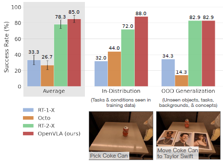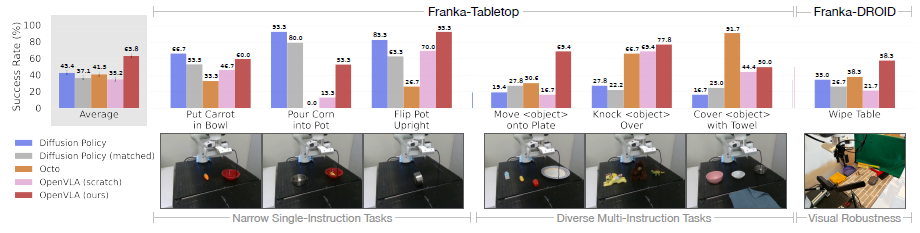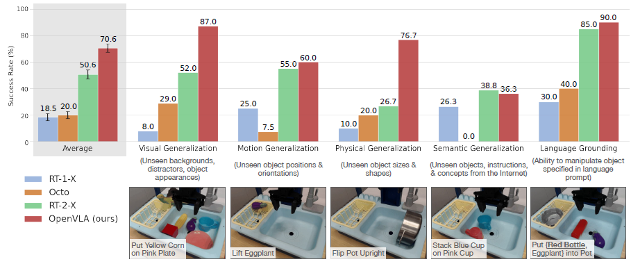 전반적으로 OpenVLA가 가장 높은 평균 성능을 달성하는 것으로 나타났습니다.