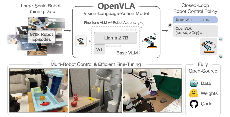 Open X-Embodiment 데이터셋 [1]에서 970k 로봇 시연으로 학습된 7B 매개변수 vision-language-action model (VLA)인 OpenVLA 모델을 소개합니다.