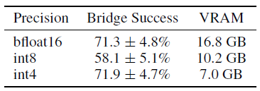 추론 속도가 감소함에 따라 8비트 양자화를 통해 성능이 크게 저하되는 것을 관찰했습니다: 우리가 평가에 사용하는 A5000 GPU에서는 모델을 1.2Hz에서만 실행할 수 있으며, 이는 BridgeData V2 작업에 사용되는 5Hz 비차단 컨트롤러의 학습 데이터셋과 비교했을 때 시스템 동역학을 크게 변화시킵니다.