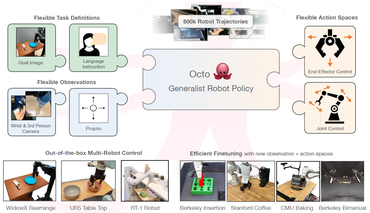Octo는 새로운 관찰 및 action 공간에 효과적으로 파인튜닝할 수 있는 최초의 GRP이자 학습 파이프라인, 모델 체크포인트, 데이터를 포함한 완전 오픈 소스인 최초의 일반 로봇 조작 policy입니다.