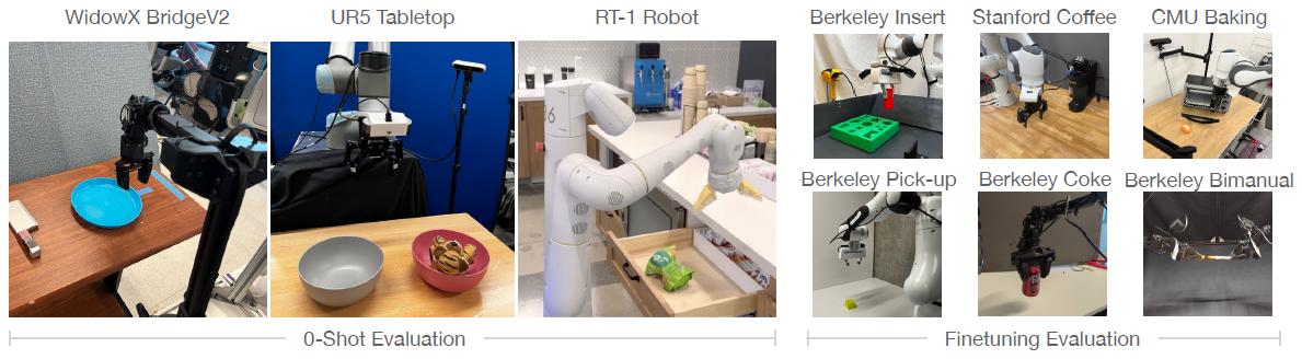 우리의 학습 혼합물에는 여러 로봇 embodiments 및 장면에서 얻은 다양한 작업의 시연 데이터가 포함되어 있습니다.