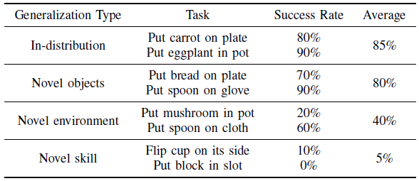 BridgeV2 도메인에서는 표 VII의 제로샷 기능에 대한 세밀한 분석을 수행하여 데이터셋에서 볼 수 있는 설정과 새로운 환경, 장면 및 기술에 대한 성능을 측정했습니다.