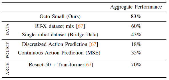 다음으로 다양한 디자인 결정이 Octo policy의 성과에 미치는 영향을 분석합니다.
