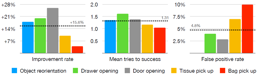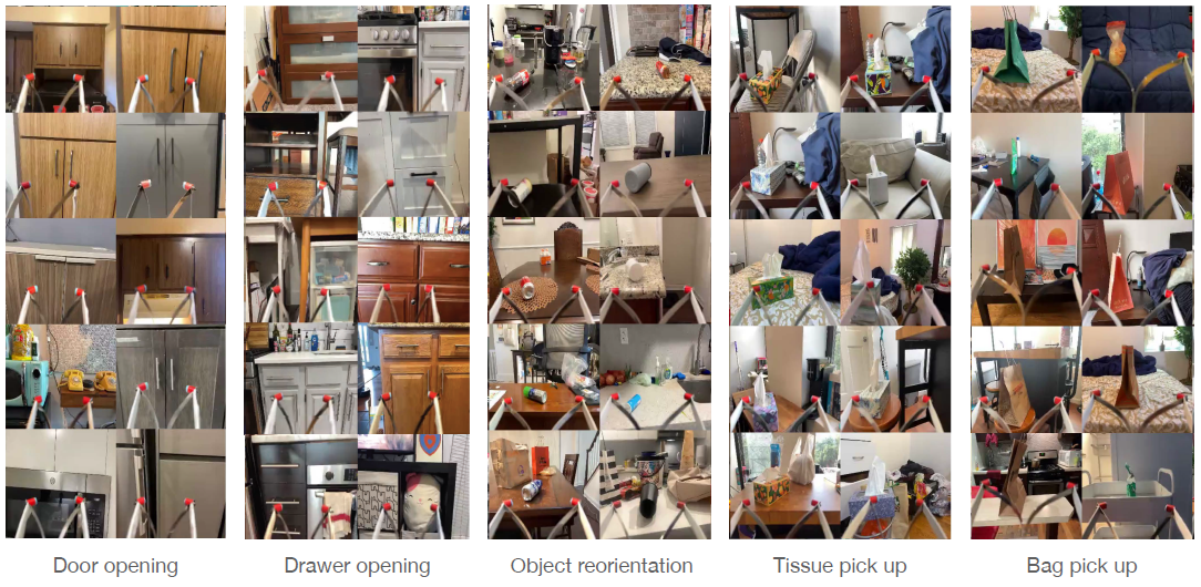우리는 opening cabinet doors, opening drawers, picking up napkins, picking up paper bags, 및 reorienting fallen objects 다섯 가지 실용적인 모델을 학습시킵니다.