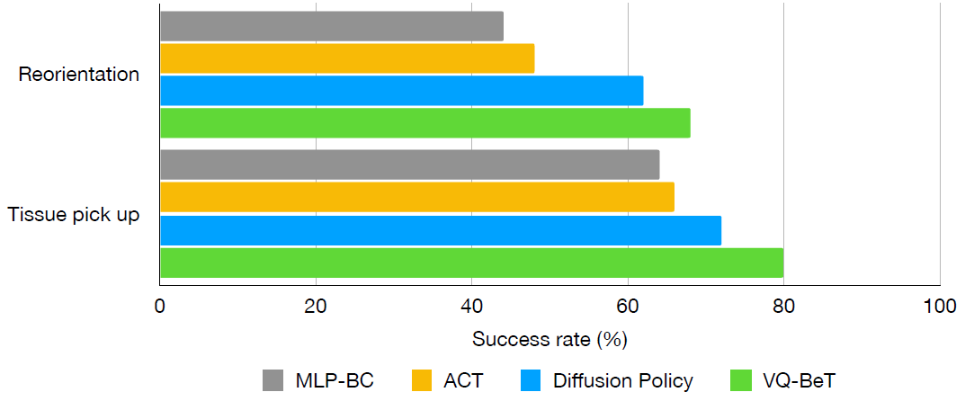 우리는 각 작업에 대해 VQ-BeT (Lee et al., 2024), Diffusion Policy (DP) (Chi et al., 2023), 그리고 두 가지 작업에 대한 베이스라인으로 ACT(Zhao et al., 2023b)와 MLP-BC를 포함한 일련의 policy 클래스를 학습시킵니다.