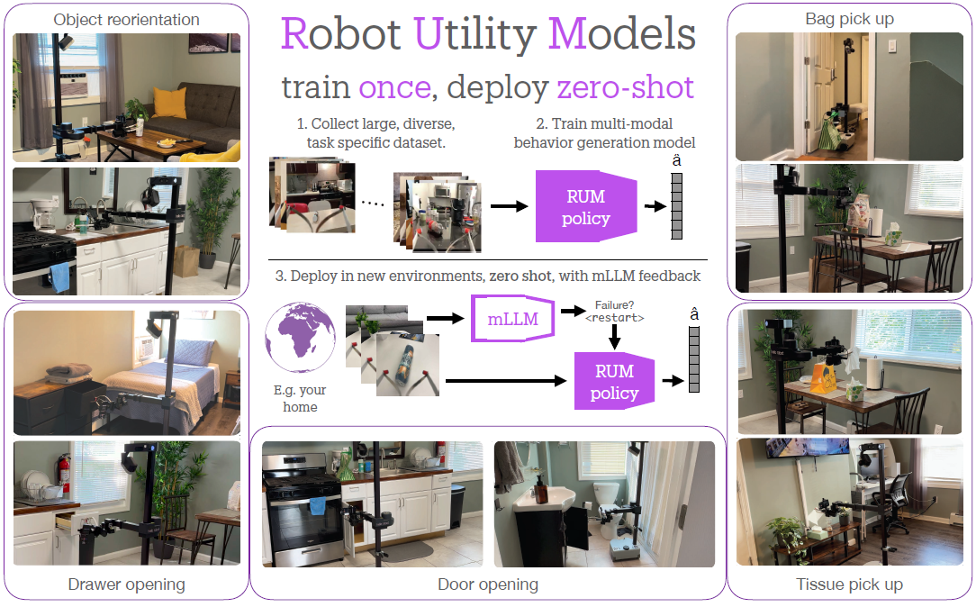 이 연구에서는 파인튜닝 없이 새로운 환경에 직접 일반화할 수 있는 제로샷 로봇 policy를 학습하고 배포하기 위한 프레임워크인 Robot Utility Models (RUM)을 소개합니다.