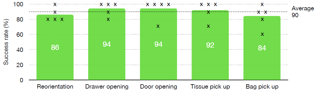 우리 시스템은 보이지 않는 새로운 환경에서 보이지 않는 물체와 상호작용할 때 평균적으로 90%의 성공률을 달성합니다.