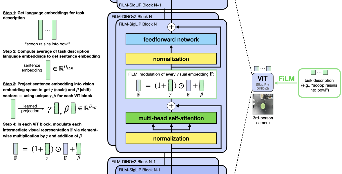 이러한 인사이트는 병렬 디코딩, action 청킹, 연속 action, L1 회귀 및 (선택적으로) FiLM 언어 조건화를 통해 새로운 로봇과 작업에 효과적으로 VLA 적응을 가능하게 하는 Optimized Fine-Tuning (OFT) 레시피로 이어집니다.