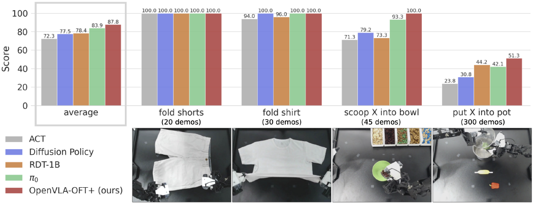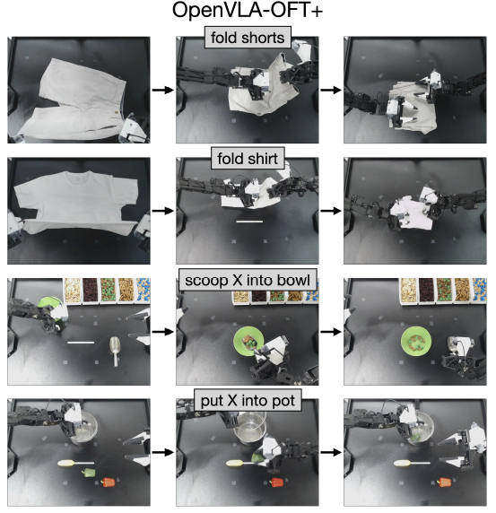 OpenVLA-OFT+는 사용자의 프롬프트를 기반으로 옷을 접거나 타겟 식품을 조작하는 등 손재주가 많은 이중 수작업 작업을 성공적으로 수행하여 파인튜닝된 VLA (π_0 및 RDT-1B)와 처음부터 학습된 저명한 모방 학습 policy (Diffusion Policy 및 ACT)을 평균 성공률에서 최대 15% (절대)까지 능가합니다.