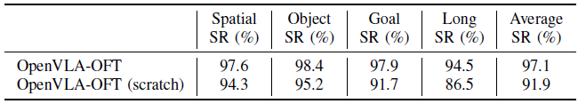 이 문제를 해결하기 위해 부록 G2에서 ablation 연구를 수행하여 OpenVLA 사전 학습 단계를 ablating하고 OFT 레시피로 기본 사전 학습된 VLM을 직접 파인튜닝합니다.