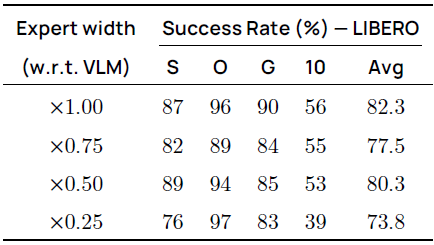 효율성 논쟁에 영감을 받아, 우리는 모델 용량이 성능에 미치는 영향을 탐구하기 위해 action expert의 숨겨진 차원을 변화시키는 것을 조사합니다.