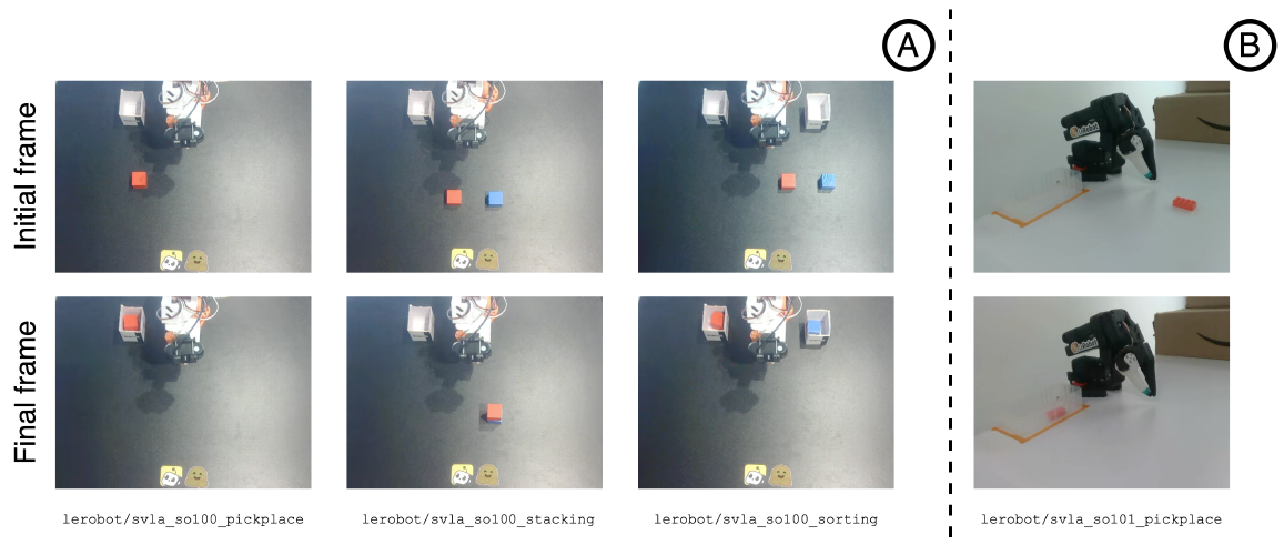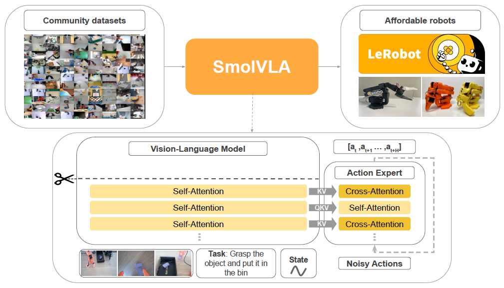 소비자용 하드웨어에서 실행되고 저비용 로봇을 제어하며 훨씬 더 큰 VLA에 필적하는 작고 효율적이며 가벼운 VLA 모델인 SmolVLA를 소개합니다.