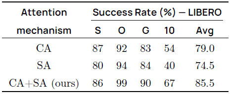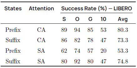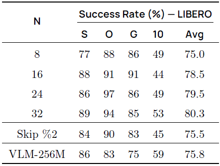 모든 ablation은 LIBERO 벤치마크에서 수행됩니다.