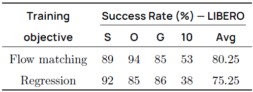 우리는 action expert v_θ를 학습시키기 위한 두 가지 학습 objective를 비교합니다: 플로우 매칭 (기본값) 및 예측된 실제 액션 청크와 실제 액션 청크에 대한 표준 회귀 L1 loss.