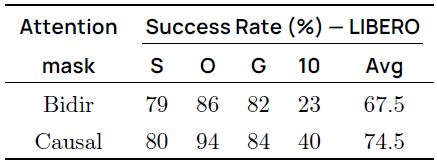 비교해 보겠습니다: (i) 액션 토큰 (순수 CA), (ii) 인과적 셀프 어텐션, (iii) 양방향 셀프 어텐션 간의 상호 작용 없음.