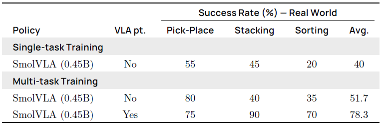 표 5에서 우리는 SmolVLA 사전 학습이 커뮤니티 데이터셋에 미치는 영향을 실제 성능의 차이로 평가하고, 멀티태스크 파인튜닝이 SmolVLA에 추가적인 이점을 제공하는지 조사합니다.