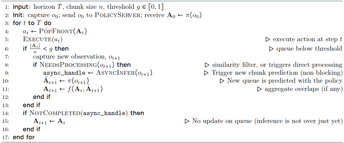 실제 배포에서 추론 속도를 향상시키기 위해 로봇은 새로운 관찰을 처리하기 전에 예측된 청크에서 여러 작업을 실행하여 현재 청크가 소진되기 전에 덮어쓸 수 있습니다.