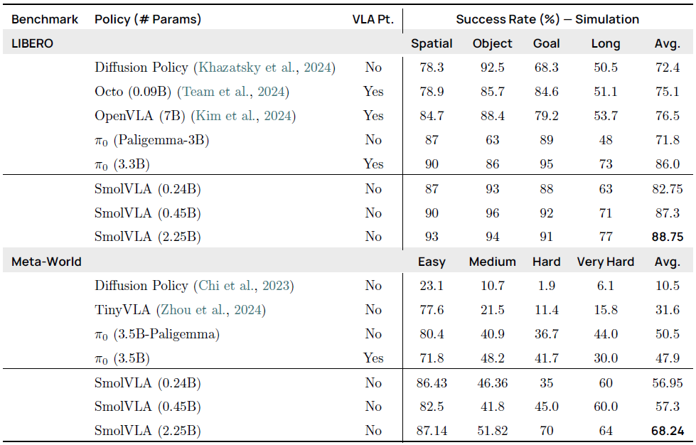 흥미롭게도, 훨씬 작지만 SmolVLA는 훨씬 더 큰 VLA 모델과 일치하거나 성능을 능가합니다.