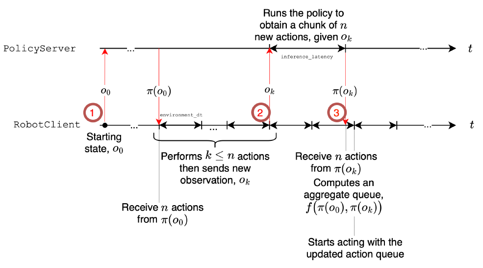 반면, 비동기 모드는 액션 실행과 policy 추론을 분리하여 예측과 제어를 병렬로 실행할 수 있게 합니다.