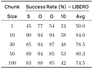 우리는 10에서 50 사이의 청크 크기가 로봇의 반응성과 효율성 사이에 좋은 균형을 제공한다는 것을 발견했습니다.