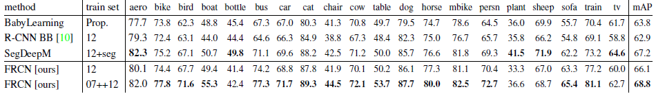 VOC10 및 2012에 대해 유사한 실험을 수행하여 VOC07 trainval, test 및 VOC12 trainval의 조합에서 21.5k 이미지의 데이터 세트를 구성합니다.